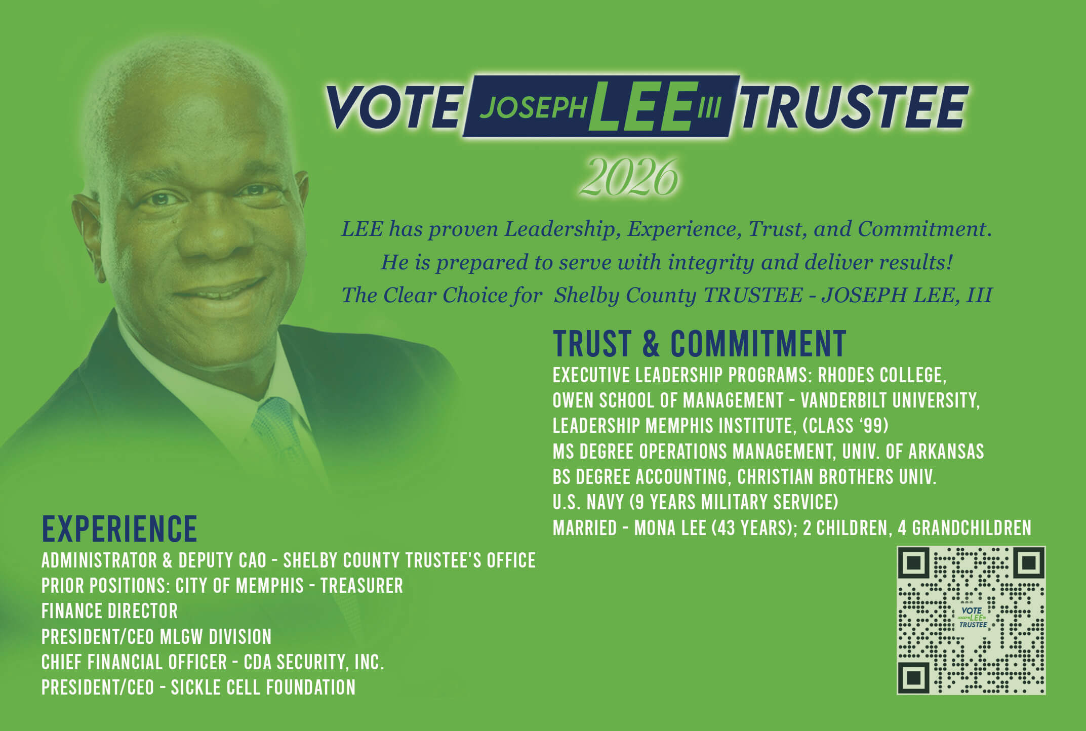 “AS THE CURRENT COUNTY TRUSTEE & HAVING WORKED WITH JOSEPH LEE FOR THE LAST 7 YEARS AND BEFORE THAT AT CITY OF MEMPHIS, I CAN SAY NO ONE ELSE IS MORE READY TO BE TRUSTEE WITH THE RIGHT EXPERIENCE AND INTEGRITY NECESSARY TO DO THE JOB DAY ONE. JOSEPH HAS SERVED OUR COMMUNITY FOR MOST OF HIS LIFE, INCLUDING THE LAST 7 YEARS IN THE TRUSTEE’S OFFICE. HE’S A FORMER MEMPHIS CITY TREASURER, FINANCE DIRECTOR, & HEAD OF MLGW. HE’S THE ONLY CANDIDATE READY TO HANDLE THE $4.5 BILLION DOLLARS GOING THROUGH THE OFFICE EVERY YEAR, AND TO BE THE COUNTY’S BANKER AND INVESTOR. I WHOLEHEARTEDLY ENDORSE HIM.”